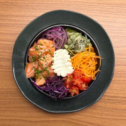 Salmão, cebola roxa, pimenta dedo de moça e coentro