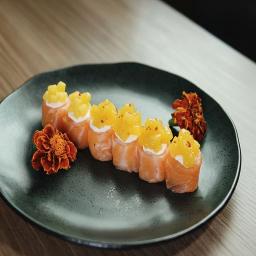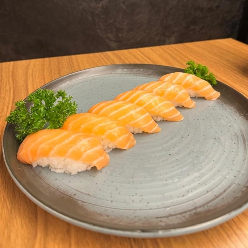 Lâmina de salmão selado, arroz e sweet chili ( 6 peças)